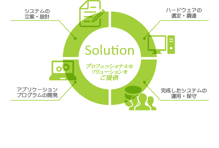 システムの立案・設計から、ハードウェアの選定・調達、アプリケーションプログラムの開発、完成したシステムの運用・保守に至るまでプロフェッショナルなソリューションをご提供いたします。